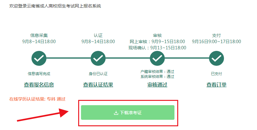 10月20日起,考生凭身份证和登录密码(报考时收到的验证码)自行登录“云南省成人高校招生考试网上报名系统”(http://ck.ynzs.cn),如遇到问题及时联系老师或考区确认点。