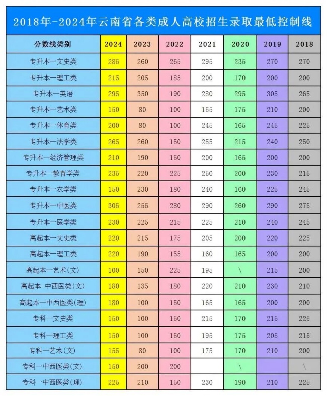根据云南省招生考试院《2025年云南省成人高校和成人中专招生考试报名通告》发布,今年考生在11月20日起可以进行成绩查询,大家耐心等待。另外按照往年的惯例招生考试院也会在当天公布今年的录取分数线。下面为大家整理的往年的录取分数线让大家参考。